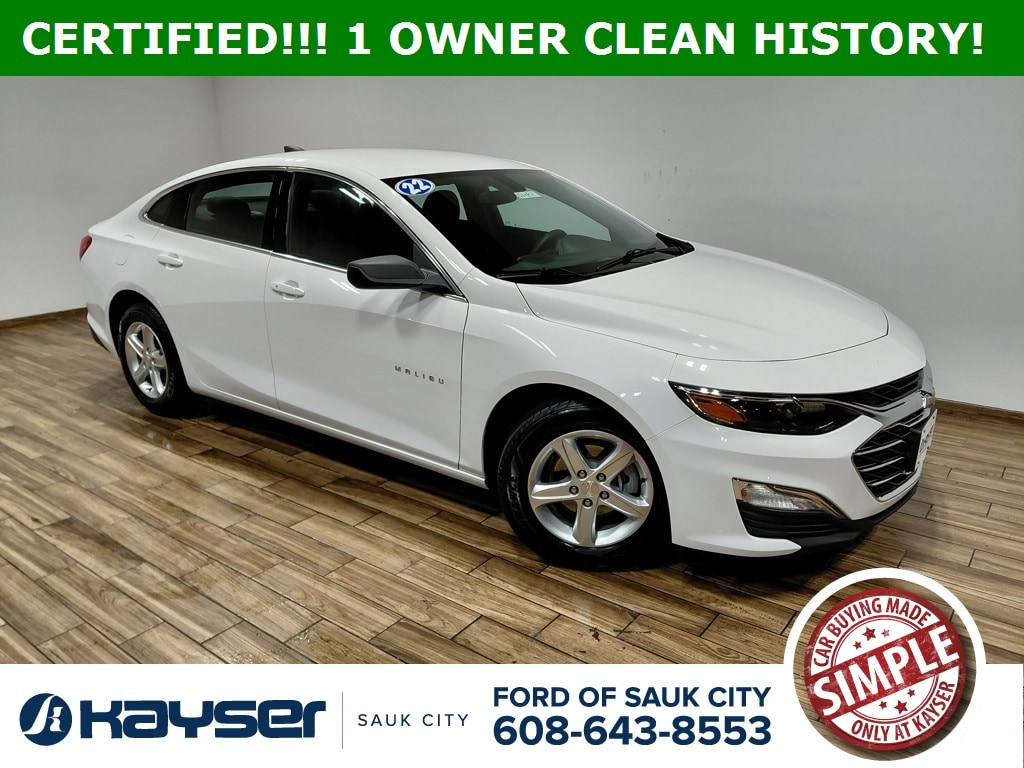 FORD BLUE CERTIFIED WARRANTY, ONE OWNER, LOW MILES, CLEAN HISTORY, AND REMOTE START, APPLE CARPLAY/ANDROID AUTO, REAR VIEW CAMERA, PRE-COLLISION ASSIST, AUTO-DIM REAR VIEW MIRROR, REMOTE KEYLESS ENTRY, Jet Black Cloth, 16" Aluminum Wheels, 4-Wheel Disc Brakes, 6-Speaker Audio System Feature, 8-Way Power Driver Seat Adjuster, ABS brakes, Air Conditioning, Brake assist, Delay-off headlights, Dual front impact airbags, Dual front side impact airbags, Electronic Stability Control, Emergency communication system: OnStar and Chevrolet connected services capable, Exterior Parking Camera Rear, Front anti-roll bar, Fully automatic headlights, Illuminated entry, Knee airbag, Low tire pressure warning, Occupant sensing airbag, Outside temperature display, Overhead airbag, Panic alarm, Passenger door bin, Power door mirrors, Power Driver Lumbar Control Seat Adjuster, Power steering, Power windows, Preferred Equipment Group 1FL, Premium Cloth Seat Trim, Radio: Chevrolet Infotainment 3 System, Rear anti-roll bar, Rear side impact airbag, Rear window defroster, Remote keyless entry, Security system, Speed control, Steering wheel mounted audio controls, Telescoping steering wheel, Tilt steering wheel, Trip computer, Variably intermittent wipers, Wireless Apple CarPlay/Android Auto. 2022 Chevrolet Malibu LS FWD Summit White