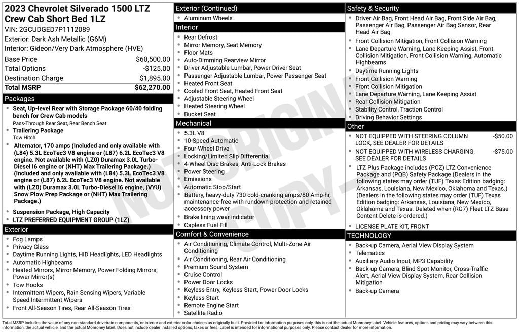 Call or email now! This one won't be here for long! A KAYSER BUYER IS A WISER BUYER! Customers who choose to buy a vehicle from us are making an informed and smart decision due to our transparent pricing, excellent customer service, and commitment to a hassle-free buying experience We do not sell Manufacturer Buybacks/Lemon Law Vehicles or any other vehicle with a bad branded title. For more information call us at 1-608-607-3082 or visit us at www.kayserjanesville.com. ONE OWNER, GM CERTIFIED, ACCIDENT FREE VEHICLE HISTORY, CLEAN HISTORY REPORT, 10-Speed Automatic, 4WD, Gideon/Very Dark Atmosphere Leather, 10-Way Power Driver Seat w/Lumbar, 10-Way Power Passenger Seat Adjuster w/Lumbar, 12.3 Multicolor Reconfigurable Digital Display, 120-Volt Bed Mounted Power Outlet, 120-Volt Instrument Panel Power Outlet, 2 USB Data Ports, Auto-Dimming Inside Rear-View Mirror, Auto-Locking Rear Differential, Bluetooth® For Phone, Chevrolet Connected Access Capable, Chrome Mirror Caps, Color-Keyed Carpeting Floor Covering, Compass, Deep-Tinted Glass, Driver Memory, Dual Rear USB Ports (Charge Only), Electric Rear-Window Defogger, Electrical Steering Column Lock, Electronic Cruise Control, Floor Mounted Center Console, Front Frame-Mounted Black Recovery Hooks, Front LED Fog Lamps, Front Rainsensing Wipers, Front Rubberized Vinyl Floor Mats, HD Surround Vision, Heated Driver & Front Outboard Passenger Seats, Heated Steering Wheel, High Capacity Suspension Package, Hitch Guidance, Hitch Guidance w/Hitch View, Integrated Trailer Brake Controller, Keyless Open & Start, LED Cargo Area Lighting, LTZ Convenience Package, LTZ Plus Package, OnStar & Chevrolet Connected Services Capable, Outside Heated Power-Adjustable Mirrors, Perimeter Lighting, Power Front Passenger Windows w/Express Up/Down, Power Front Windows w/Driver Express Up/Down, Power Rear Windows w/Express Down, Power Tailgate, Power Tilt & Telescoping Steering Column, Preferred Equipment Group 1LZ, Premium Bose 7-Speaker Sound System, Rear Cross Traffic Alert-Braking, Rear Pedestrian Alert, Rear Rubberized-Vinyl Floor Mats, Rear Wheelhouse Liners, Remote Vehicle Starter System, Safety Alert Seat, Safety Package, SiriusXM w/360L, Standard Tailgate, Steering Wheel Audio Controls, Theft Deterrent System (Unauthorized Entry), Trailer Camera Provisions, Trailer Side Blind Zone Alert, Trailering App, Trailering Package, Ultrasonic Front & Rear Park Assist, Up-Level Rear Seat w/Storage Package, Ventilated Driver & Front Passenger Seats, Wi-Fi Hot Spot Capable, Wireless Charging, Wireless Phone Projection, Wrapped Steering Wheel.
