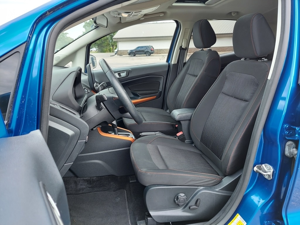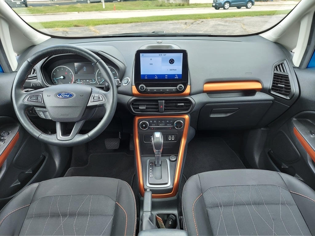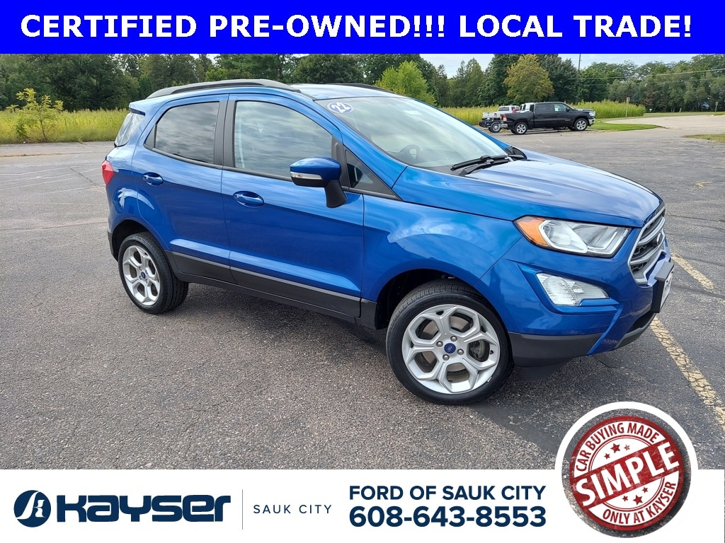 New Price! FORD BLUE CERTIFIED WARRANTY, ONE OWNER, LOCAL TRADE, NEW TIRES, HEATED SEATS, AND REMOTE START, APPLE CARPLAY/ANDROID AUTO, MOONROOF, REAR VIEW CAMERA, 4WD, REMOTE KEYLESS ENTRY, REVERSE SENSING SYSTEM, FORD PASS, 4-Wheel Disc Brakes, ABS brakes, Air Conditioning, AppLink/Apple CarPlay and Android Auto, Automatic temperature control, Brake assist, Compass, Delay-off headlights, Driver door bin, Driver vanity mirror, Dual front impact airbags, Dual front side impact airbags, Electronic Stability Control, Emergency communication system: SYNC 3 911 Assist, Equipment Group 200A, Exterior Parking Camera Rear, Front anti-roll bar, Front Bucket Seats, Front Center Armrest, Front fog lights, Front reading lights, Front wheel independent suspension, Fully automatic headlights, Heated front seats, Illuminated entry, Knee airbag, Leather Shift Knob, Leather-Wrapped Steering Wheel, Low tire pressure warning, Occupant sensing airbag, Orange Instrument Panel Appliques, Outside temperature display, Overhead airbag, Overhead console, Panic alarm, Passenger vanity mirror, Power door mirrors, Power moonroof, Power steering, Power windows, Radio: AM/FM/MP3 Stereo, Rear anti-roll bar, Rear Parking Sensors, Rear seat center armrest, Rear side impact airbag, Rear window defroster, Rear window wiper, Remote keyless entry, Roof rack: rails only, SE Appearance Package, SiriusXM Radio, Speed control, Speed-sensing steering, Split folding rear seat, Steering wheel mounted audio controls, SYNC 3 Communications & Entertainment System, Tachometer, Telescoping steering wheel, Tilt steering wheel, Traction control, Trip computer, Turn signal indicator mirrors, Unique Cloth Heated Front Bucket Seats w/47A, Variably intermittent wipers, Wheels: 17" Shadow Silver Aluminum. 2022 Ford EcoSport SE 4WD Lightning Blue Metallic