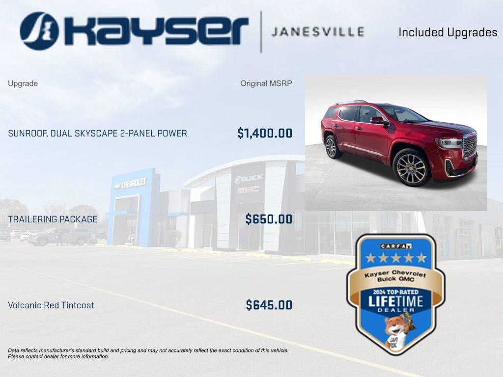 Call or email now! This one won't be here for long! A KAYSER BUYER IS A WISER BUYER! Customers who choose to buy a vehicle from us are making an informed and smart decision due to our transparent pricing, excellent customer service, and commitment to a hassle-free buying experience We do not sell Manufacturer Buybacks/Lemon Law Vehicles or any other vehicle with a bad branded title. For more information call us at 1-608-607-3082 or visit us at www.kayserjanesville.com.