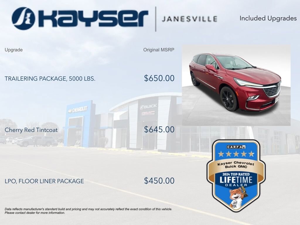 Elevate your driving experience with this meticulously maintained 2024 Buick Enclave Essence. This all-wheel-drive SUV boasts a powerful 3.6L V6 engine, delivering an impressive blend of performance and efficiency with 17 city/25 highway MPG.Highlighted features include: 5,000 lbs Trailering Package Floor Liner Package (LPO) Front Mounting License Plate Bracket PackageThe Enclave Essence offers a refined and well-equipped interior, with luxurious perforated leather-appointed seating, heated front seats, and a premium Buick Infotainment System with wireless Apple CarPlay and Android Auto. Enjoy the convenience of a power liftgate, remote keyless entry, and a host of advanced safety technologies, including OnStar and Buick connected services.As a Buick Certified Pre-Owned vehicle, this Enclave has undergone a rigorous 172-point inspection and comes with a comprehensive warranty and maintenance plan. You can purchase with confidence, knowing that this SUV has been meticulously cared for and is ready to provide you with years of reliable and enjoyable driving.Don't miss the opportunity to experience the exceptional quality and versatility of the 2024 Buick Enclave Essence. Contact us today to schedule a test drive and discover why this SUV is the perfect blend of style, comfort, and capability.Buick Certified Pre-Owned 172 Point Inspection Roadside Assistance Warranty Deductible: $0 Transferable Warranty Vehicle History Limited Warranty: 12 Month/12,000 Mile (whichever comes first) from certified purchase date Powertrain Limited Warranty: 72 Month/100,000 Mile (whichever comes first) from original in-service date 24 months/24,000 miles (whichever comes first) Certified Pre-Owned Scheduled Maintenance Plan and 3 days/150 miles (whichever comes first) Vehicle Exchange Program. 1 month of OnStar Safety & Security Plan, Navigation Services, Remote Access Plan, and 1 month or 3GB of 4G LTE data (whichever comes first).