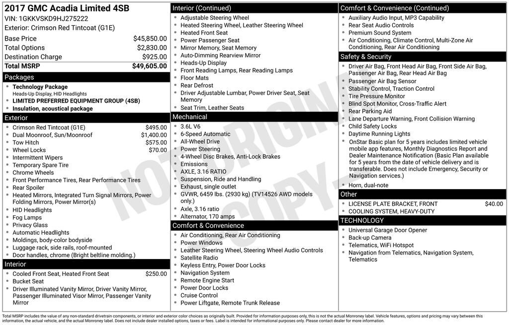 CARFAX One-Owner.2017 Acadia LimitedCall or email now! This one won't be here for long! A KAYSER BUYER IS A WISER BUYER! Customers who choose to buy a vehicle from us are making an informed and smart decision due to our transparent pricing, excellent customer service, and commitment to a hassle-free buying experience We do not sell Manufacturer Buybacks/Lemon Law Vehicles or any other vehicle with a bad branded title. For more information call us at 1-608-607-3082 or visit us at www.kayserjanesville.com.