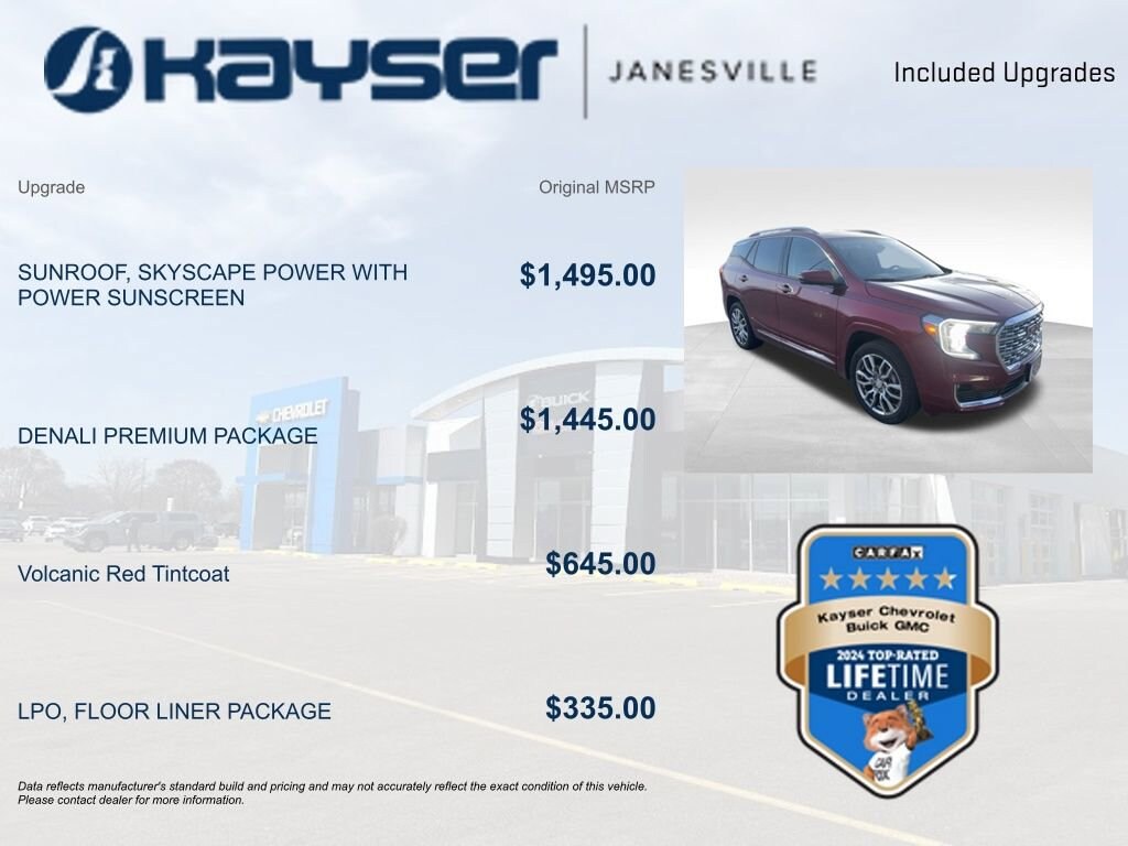 Elevate your driving experience with the exceptional 2023 GMC Terrain Denali. This stunning SUV boasts a captivating Volcanic Red Tintcoat exterior, complemented by a well-appointed interior that exudes sophistication and comfort.- Skyscape Power Sunroof with Power Sunscreen- Denali Premium Package- Floor Liner Package (LPO)- License Plate Front Mounting PackagePowered by a 1.5L DOHC engine paired with a 9-Speed Automatic transmission and All-Wheel Drive, this Terrain Denali delivers a remarkable blend of performance and efficiency, with an EPA-estimated 24 MPG in the city and 28 MPG on the highway.Step inside and be greeted by the Denali's premium features, including the Bose Sound System, Wireless Apple CarPlay/Android Auto, and the advanced GMC Infotainment System with Navigation. Enjoy the convenience of dual-zone automatic climate control, while the heated and ventilated front seats and heated rear outboard seats provide unparalleled comfort.Safety is also a top priority, with features like Adaptive Cruise Control, Lane Departure Warning, and the HD Surround Vision camera system ensuring you and your passengers arrive at your destination with confidence.This 2023 GMC Terrain Denali is a certified pre-owned vehicle, meaning it has undergone a rigorous inspection and comes with the assurance of a comprehensive warranty. With just 19,600 miles on the odometer, this SUV is ready to embark on your next adventure.Call or email now! This one won't be here for long! A KAYSER BUYER IS A WISER BUYER! Customers who choose to buy a vehicle from us are making an informed and smart decision due to our transparent pricing, excellent customer service, and commitment to a hassle-free buying experience We do not sell Manufacturer Buybacks/Lemon Law Vehicles or any other vehicle with a bad branded title. For more information call us at 1-608-607-3082 or visit us at www.kayserjanesville.com.