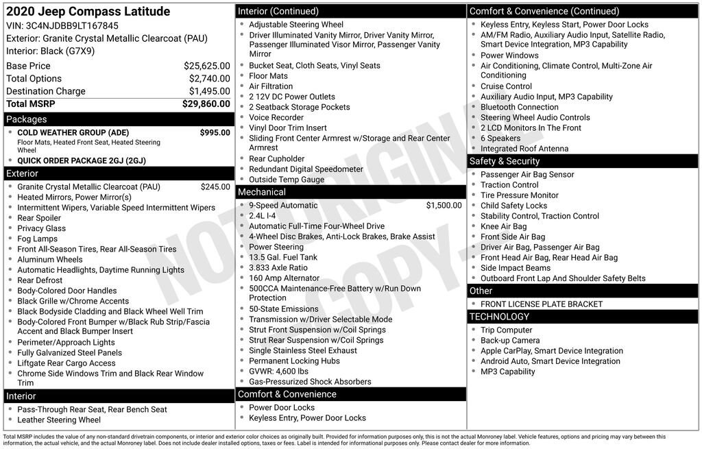 CARFAX One-Owner.2020 CompassCall or email now! This one won't be here for long! A KAYSER BUYER IS A WISER BUYER! Customers who choose to buy a vehicle from us are making an informed and smart decision due to our transparent pricing, excellent customer service, and commitment to a hassle-free buying experience We do not sell Manufacturer Buybacks/Lemon Law Vehicles or any other vehicle with a bad branded title. For more information call us at 1-608-607-3082 or visit us at www.kayserjanesville.com. 4WD.