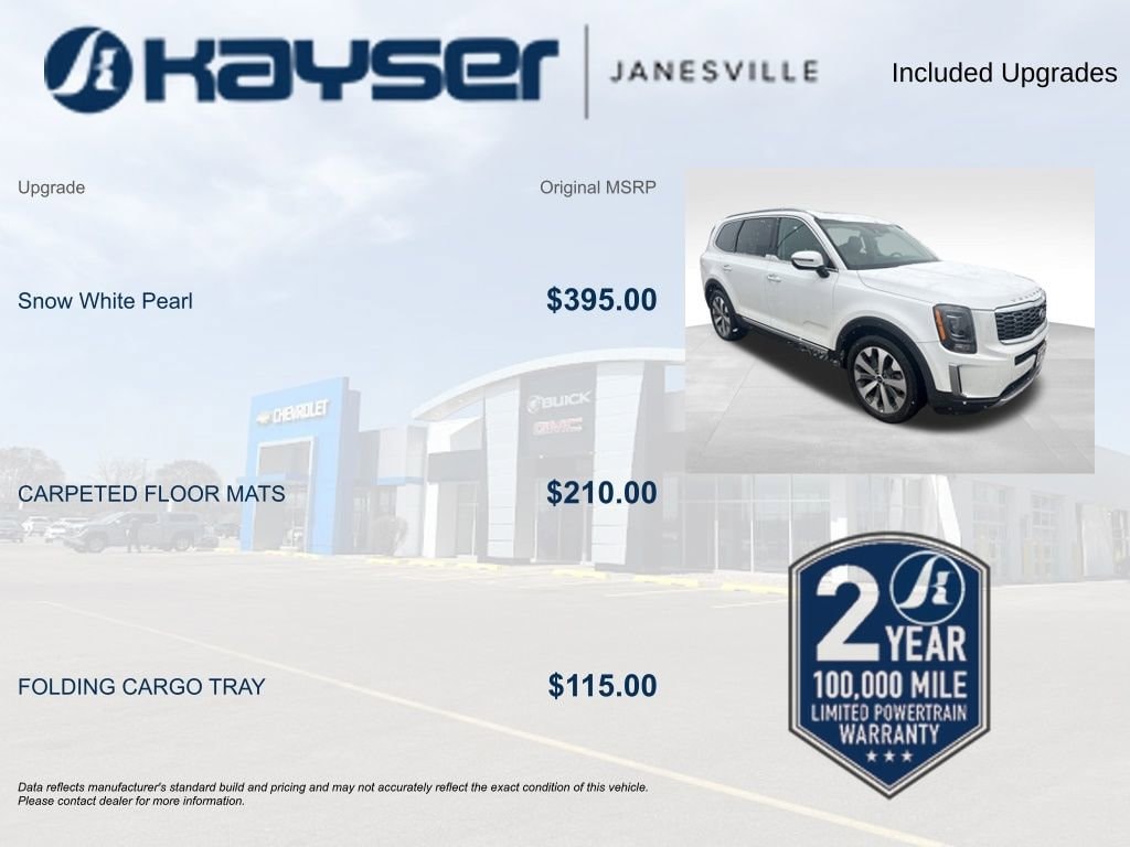 Q Certified has a 2 year or 100,000 miles (whatever comes first) powertrain warranty. We stand behind our vehicles. That's why it's Q Certified!This 2020 Kia Telluride S is a stunning SUV that combines exceptional capability, advanced technology, and refined style. With its spacious interior, versatile cargo space, and impressive performance, this Telluride is the perfect companion for your adventures. Snow White Pearl Exterior CARPETED FLOOR MATS FOLDING CARGO TRAYBoasting a powerful 3.8L V6 engine and all-wheel drive, the Telluride delivers a confident and responsive driving experience, whether you're navigating city streets or tackling rugged terrain. With an EPA-estimated 19 MPG in the city and 24 MPG on the highway, this SUV offers impressive efficiency to help you go further.Inside, the Telluride S pampers you with a wealth of premium features, including heated front seats, a power driver's seat, and a panoramic sunroof that floods the cabin with natural light. The advanced infotainment system, complete with Apple CarPlay and Android Auto, keeps you connected and entertained on the go.Safety is also a top priority, with a suite of advanced driver assistance technologies, including forward collision warning, automatic emergency braking, and lane keep assist, working tirelessly to help protect you and your loved ones.With its sleek, modern styling and impressive capabilities, this 2020 Kia Telluride S is a standout in the SUV segment. Whether you're looking for a family-friendly hauler, an adventure-ready companion, or a stylish daily driver, this Telluride is sure to exceed your expectations.Don't miss your chance to experience the exceptional quality and value of this Kia Telluride. Call or email now to schedule a test drive and see for yourself why this SUV is the perfect choice for your next vehicle.Call or email now! This one won't be here for long! A KAYSER BUYER IS A WISER BUYER! Customers who choose to buy a vehicle from us are making an informed and smart decision due to our transparent pricing, excellent customer service, and commitment to a hassle-free buying experience We do not sell Manufacturer Buybacks/Lemon Law Vehicles or any other vehicle with a bad branded title. For more information call us at 1-608-607-3082 or visit us at www.kayserjanesville.com.
