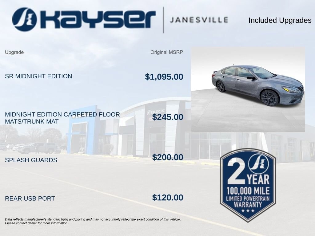 2018 AltimaCall or email now! This one won't be here for long! A KAYSER BUYER IS A WISER BUYER! Customers who choose to buy a vehicle from us are making an informed and smart decision due to our transparent pricing, excellent customer service, and commitment to a hassle-free buying experience We do not sell Manufacturer Buybacks/Lemon Law Vehicles or any other vehicle with a bad branded title. For more information call us at 1-608-607-3082 or visit us at www.kayserjanesville.com. CVT with Xtronic.