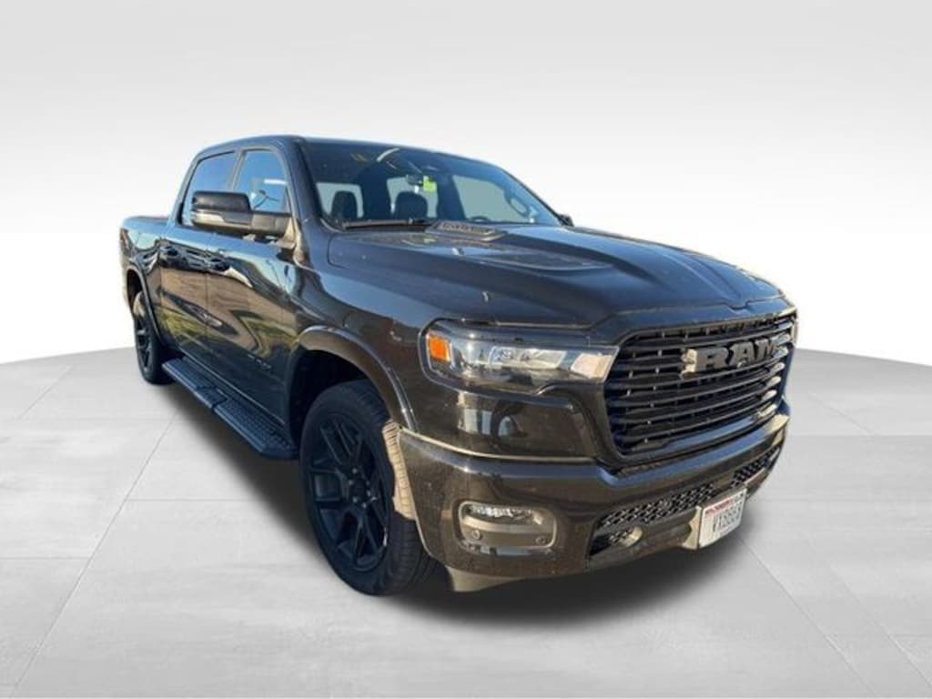 2025 RAM 1500 LARAMIE NIGHT EDITION CREW CAB 4X4 IN DIAMOND BLACK CRYSTAL PEARL COAT WITH ONLY 5403 MILES THIS TRUCK IS ABSOLUTELY LOADED WITH LUXURY STYLE AND PERFORMANCE AND IT LOOKS EVEN BETTER IN PERSON